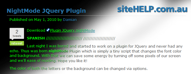 Last night I was bored and started to work on a plugin for JQuery and never had any echo. Así nacio nightMode Plugin que es simplemente un script chiquitito que cambia el color de las letras y el fondo de pantalla. Thus was born nightMode Plugin which is simply a tiny script that changes the font color and background. Con eso logramos ahorrar un poco de energia apagando algunos pixeles de nuestra pantalla y además nos facilita la lectura. With that we can save some energy by turning off some pixels of our screen and we’ll ease of reading. Espero que les guste!! Hope you like it!