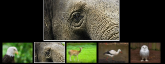 <div id="imageview"> <img src="images/sample1.jpg" alt="example" /> </div> <div id="thumbnails"> <a href="images/sample1.jpg" class="active"><img src="images/thumbnails/sample1.jpg" alt="" /></a> <a href="images/sample2.jpg"><img src="images/thumbnails/sample2.jpg" alt="" /></a> <a href="images/sample3.jpg"><img src="images/thumbnails/sample3.jpg" alt="" /></a> <a href="images/sample4.jpg"><img src="images/thumbnails/sample4.jpg" alt="" /></a> <a href="images/sample5.jpg"><img src="images/thumbnails/sample5.jpg" alt="" /></a> </div> <script type="text/javascript"> jQuery(document).ready(function() { $('#thumbnails').simplethumbs({slideshow: '#imageview'}); }); </script>
